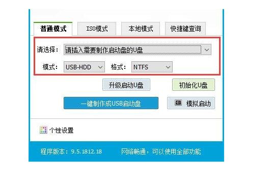 3.選擇普通模式選項卡,“請選擇”中選擇自身U盤設備名稱(一般會自動識別)。模式選擇USB—HDD,格式選擇“NTFS”。
