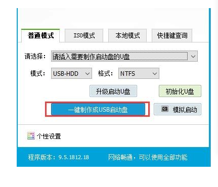 3.選擇普通模式選項卡,“請選擇”中選擇自身U盤設備名稱(一般會自動識別)。模式選擇USB—HDD,格式選擇“NTFS”。