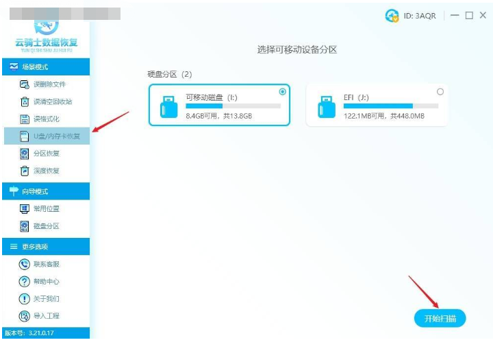 2、緊接著在【場景模式】下選擇【U盤/內存卡恢復】,選擇格式化的u盤,單擊【開始掃描】。