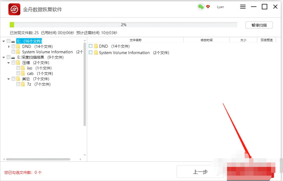 3、掃描過程中如果已經找到需要恢復的文件,直接勾選中點擊“恢復”即可,無需等到掃描結束。
