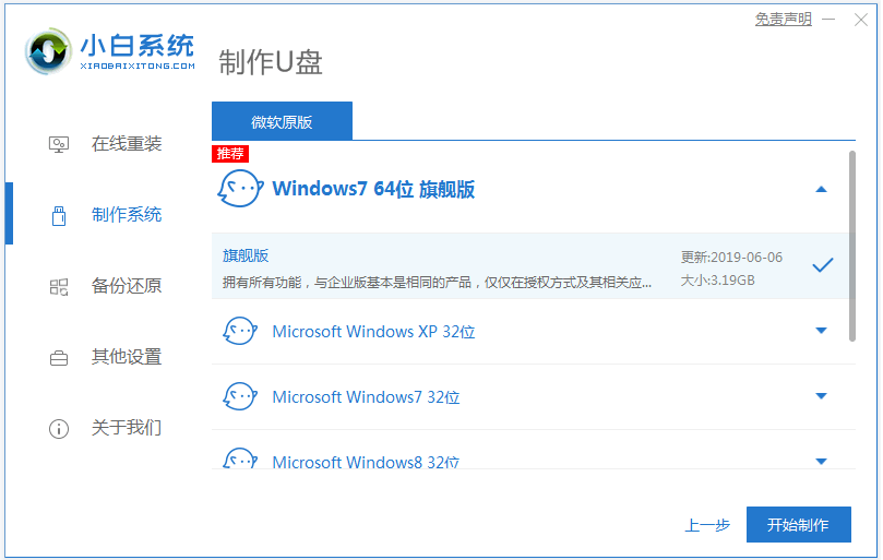 2、選擇需要安裝的windows系統,點擊開始制作u盤啟動盤。