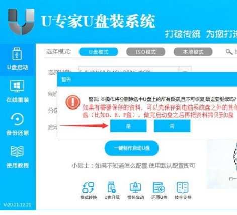 U盤里有用的文件可以先保存到電腦里,制作完成再拷貝回來。如果沒有需要的,直接點“是”。