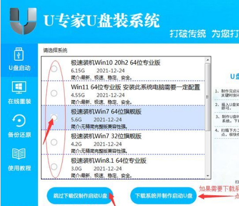 第四步:選擇您需要下載的系統,然后點擊“下載系統并制作啟動U盤”按鈕。如果您不需要下載系統,就直接點“跳過”按鈕