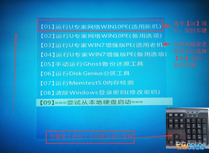 第八步:這時候會進入到下邊這個界面,用鍵盤上的上方向鍵進行選擇,一般選擇第一行【01】,然后按回車鍵,如果電腦非常老,可以選擇第三行【03】,然后按回車鍵,就可以進入pe。