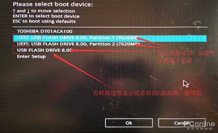 第七步:設置電腦從u盤啟動以上六步你都做好了以后,接下來就可以將做好的U盤插入到你要重裝系統的電腦usb接口上,不管是筆記本還是臺式機都可以的!下邊以華碩電腦為例,它的快捷鍵是“F8”鍵,在需要安裝系統的電腦上插入U盤,開機重啟電腦時就連續快按F8鍵,就會進入下面界面: