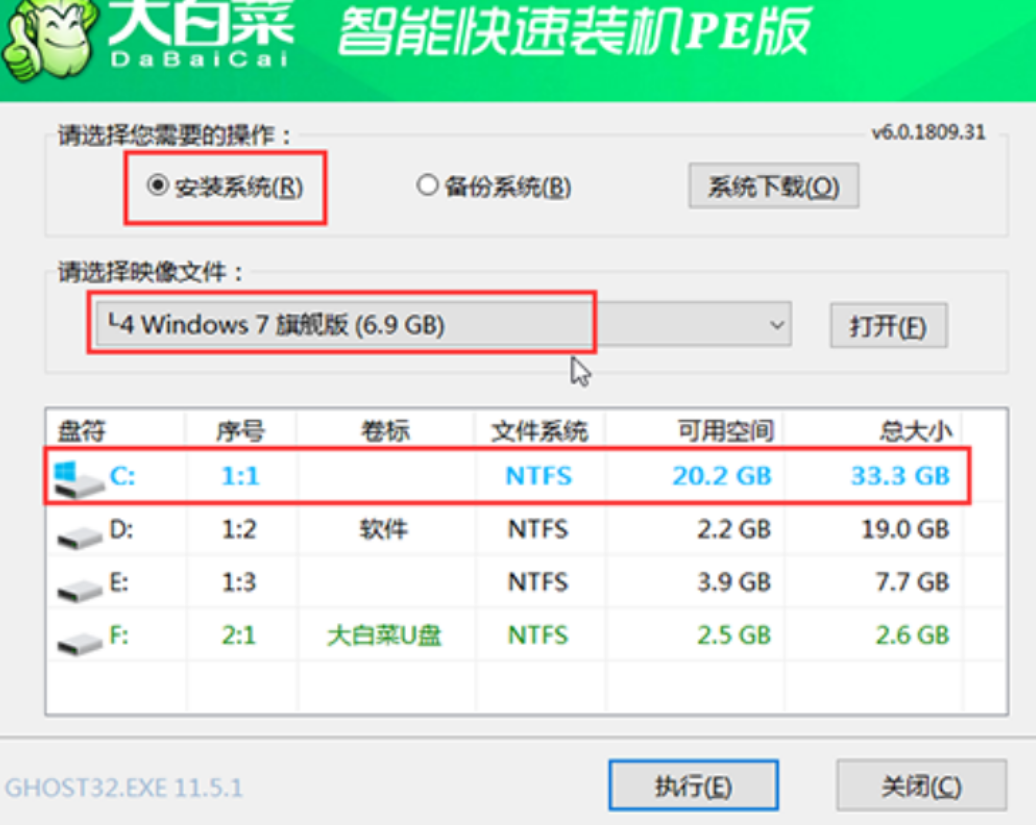 3、在桌面上找到并打開大白菜一鍵重裝,進入重裝界面后,選擇“安裝系統”,選擇已下載的win7鏡像系統作為“映像文件”,勾選安裝路徑為“C盤”,最后點擊“執行”。