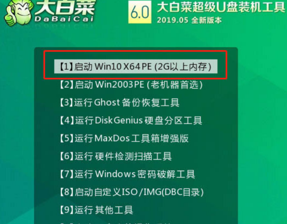 2、選擇【1】Win10X64PE(2G以上內存),回車進入大白菜PE桌面。