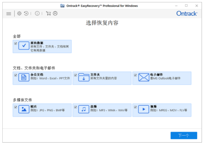 EasyRecovery數據恢復工具不僅能恢復本地本機的文件內容,移動設備的數據一樣可以恢復,比如U盤外接設備,在進入軟件之后可以看到恢復內容的幾個板塊,比如包含了所有文件,文件夾,文檔,音頻等等數據,還有單獨的文件夾,電子郵件數據恢復功能,還有多媒體文件恢復功能,比如MP3,PNG,BMP等等內容,包括視頻文件和音頻文件等等,恢復算法強大,基本上都能完全修復,還是比較推薦這款工具的。