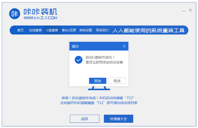 3、裝機軟件開始制作u盤啟動盤。等待成功后快速預覽需要安裝的電腦主板的啟動熱鍵,然后再拔除u盤退出。