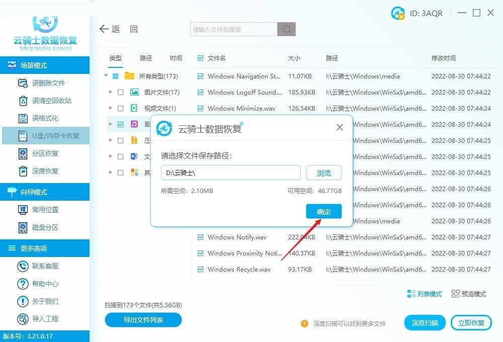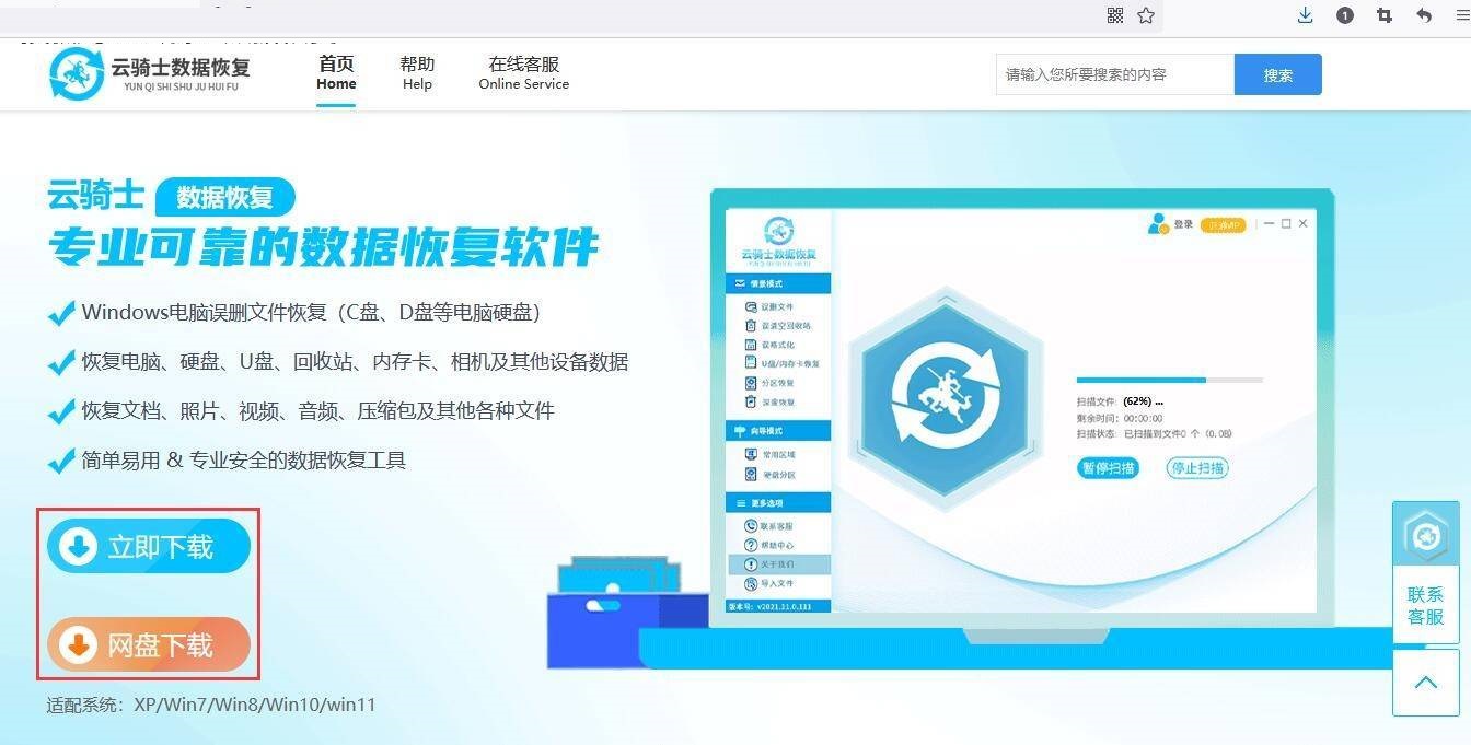 1.將U盤插入電腦中,到官網下載U盤文件恢復軟件——云騎士數據恢復軟件,并在電腦中安裝運行。