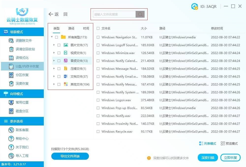 3.文件掃描工作結束后,在文件類型、文件大小、文件名等方式下找到所需文件。