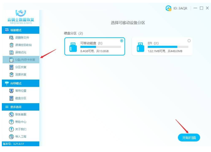 2.緊接著在【場景模式】下選擇【U盤/內存卡恢復】,選擇格式化的u盤,單擊【開始掃描】。