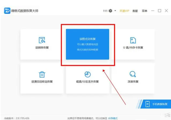 1:運行電腦上安裝好的【嗨格式數據恢復大師】軟件,軟件主頁上有六個恢復模式,這里需要點擊“誤格式化恢復”模式;