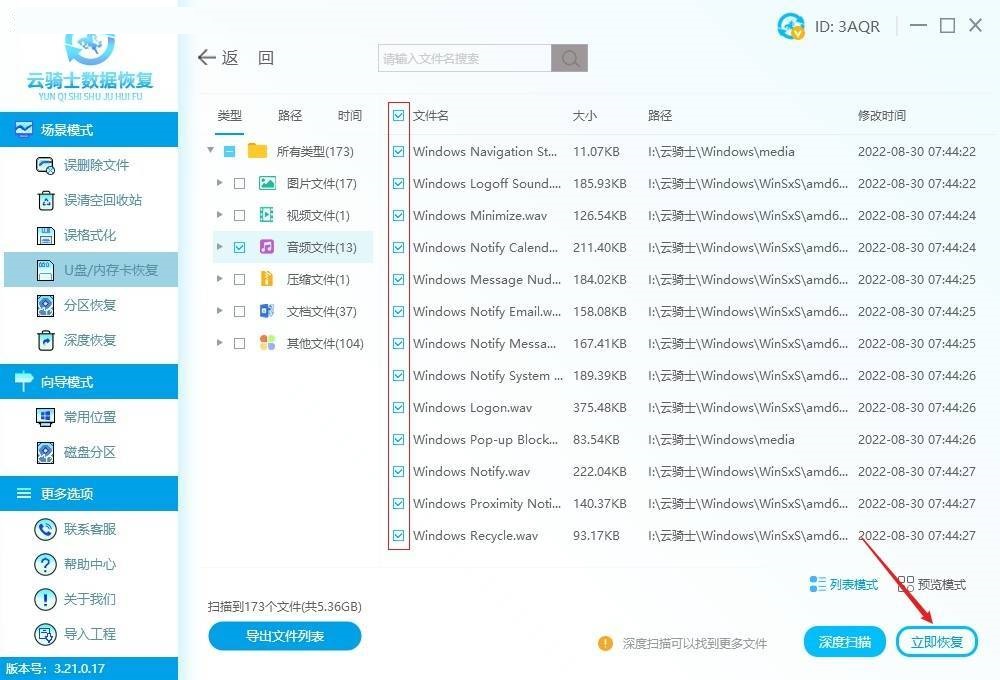 3、耐心等待掃描完成后,選中需要恢復的文件,點擊立即恢復。