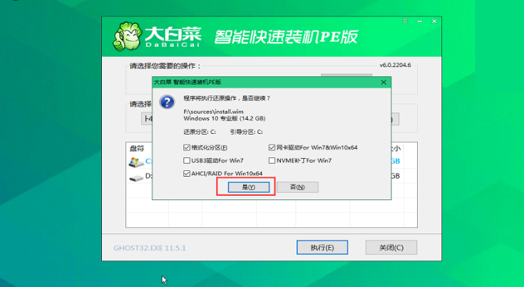 6、程序寫入,耐心等待安裝完畢后點擊 “是” 重啟電腦,同時拔掉U盤,以免再次進入大白菜winpe系統的界面。