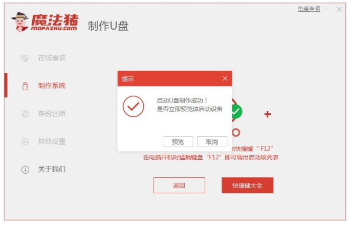 3、耐心等待軟件制作u盤啟動盤,快速預覽需要安裝的電腦主板的啟動熱鍵,再拔除u盤退出。