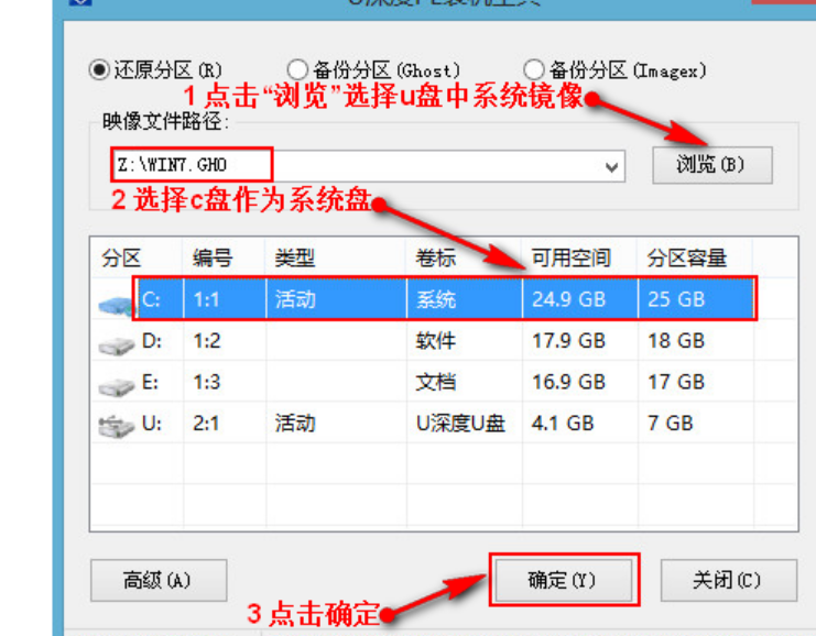 進入pe后會自啟u深度pe裝機工具,首先點擊"瀏覽"將保存在u盤的系統鏡像添加進來,接著選擇c盤作系統盤存放鏡像,點擊“確定”即可。
