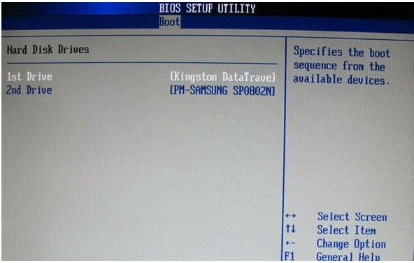 3、在硬盤驅動器“Hard Disk Drives”界面選擇U盤為第一啟動設備“1st Drive”。如果先在“Hard Disk Drives”里面選擇U盤為第一啟動設備,那么這里就會顯示有U盤,直接選擇U盤為第一啟動設備,如圖下圖所示。