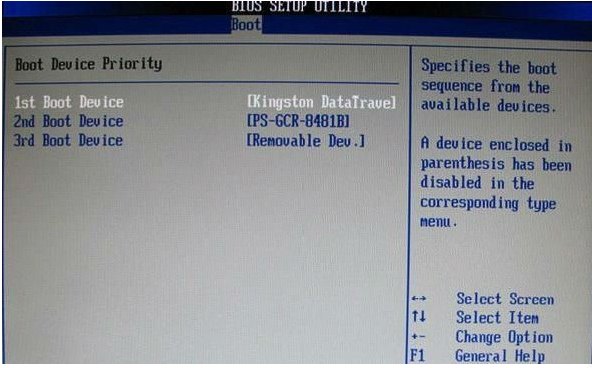4、選擇U盤為第一啟動設備“1st Drive”后,啟動優先級設備選擇(Boot Device Priority)里面會顯示U盤,這時就是優先選擇U盤作為第一啟動設備(1st Boot Device)了。