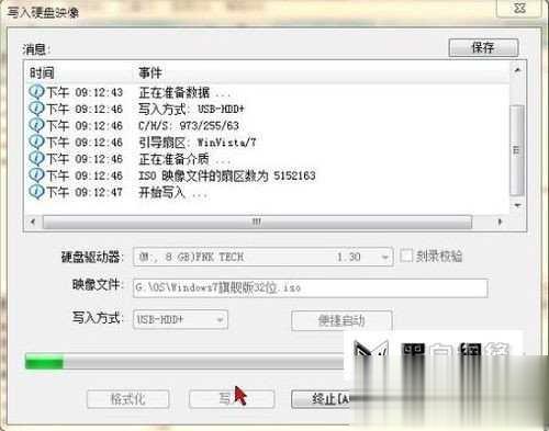 4、接下來在彈出的窗口直接點擊“寫入”按鈕(注:將寫入方式選擇為“USB-HDD+”,如果不是這個模式,可能導致電腦無法通過U盤正常啟動。
