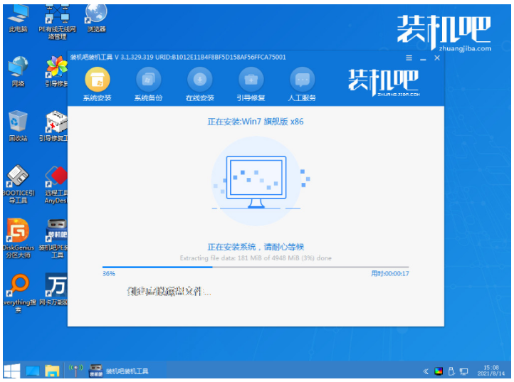 5、進入到pe系統之后,雙擊打開裝機吧裝機工具,我們選擇需要安裝的win7系統,點擊安裝到系統盤c盤,點擊開始安裝。