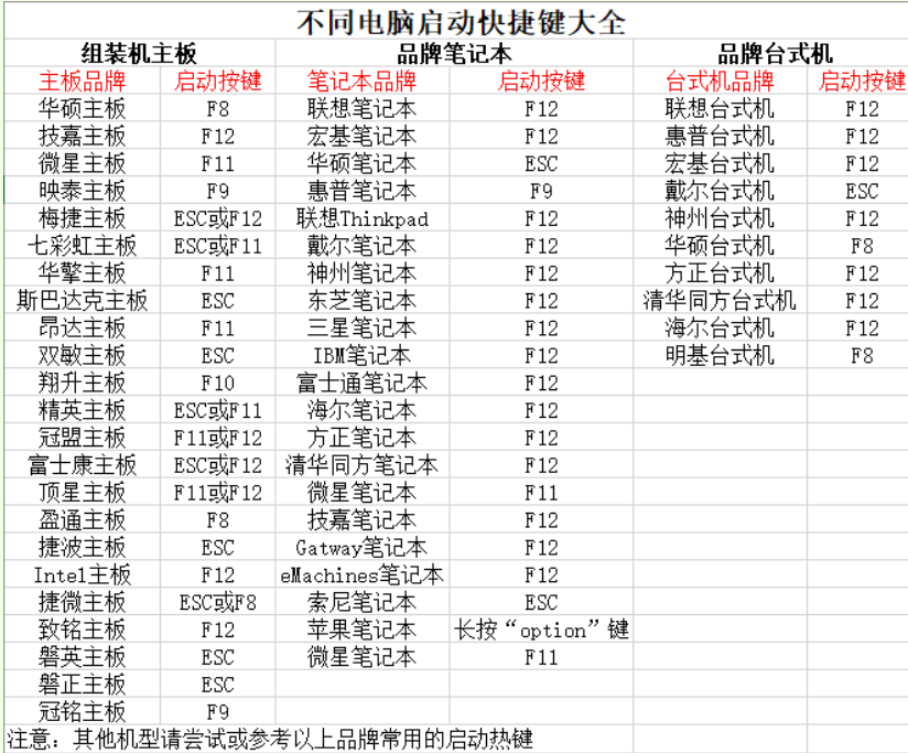 3、然后查詢自己的電腦品牌的u盤啟動快捷鍵,或者參考如下圖所示。
