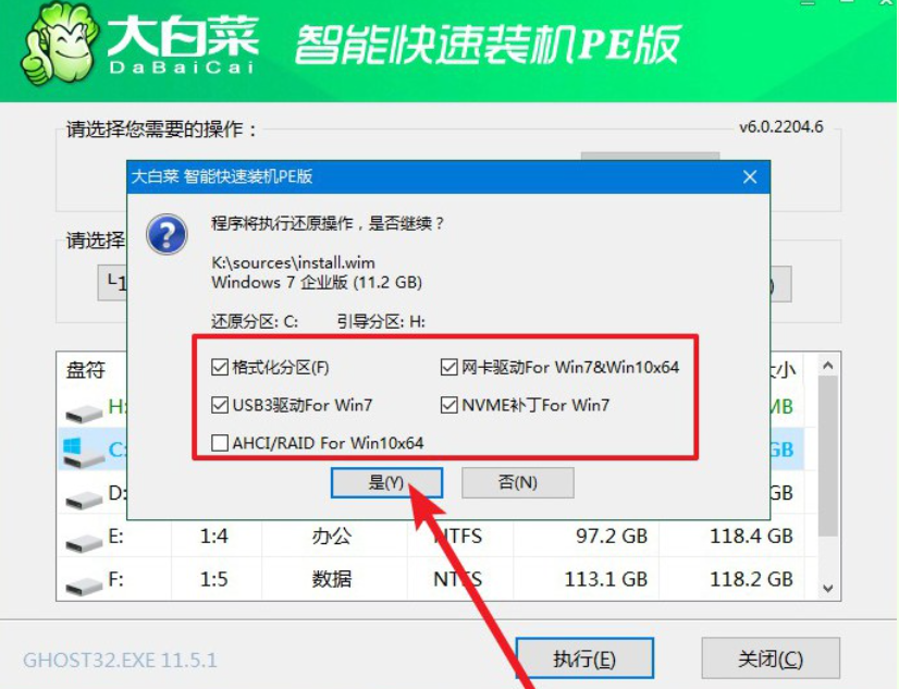 7、在彈出還原設置窗口,建議大家默認勾選,點擊“是”進入下一步。