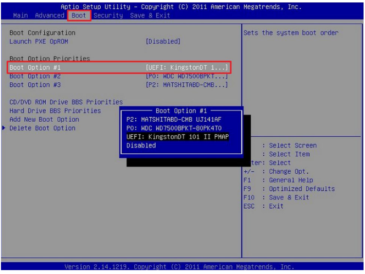 6、我們進入界面之后在Boot里選擇Boot Option #1,再選擇UEFI:KingstonDT 101 II PMAP。