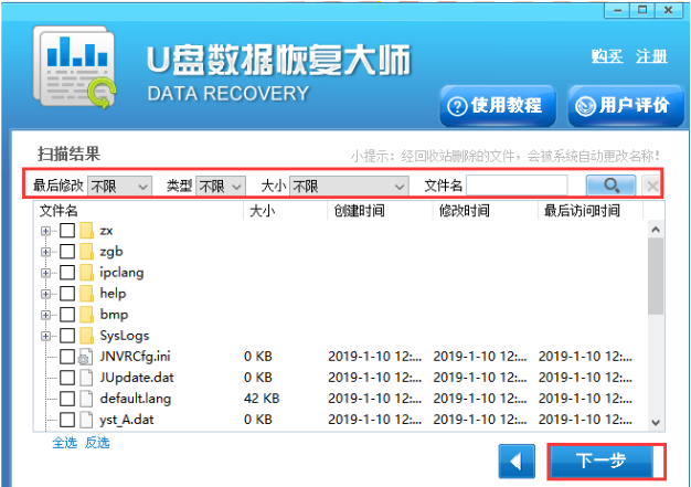 4、U盤數據恢復大師軟件掃描完成后,我們就可以在界面中看到刪除的文件了,我們選中自己要恢復的文件,然后點擊下一步。