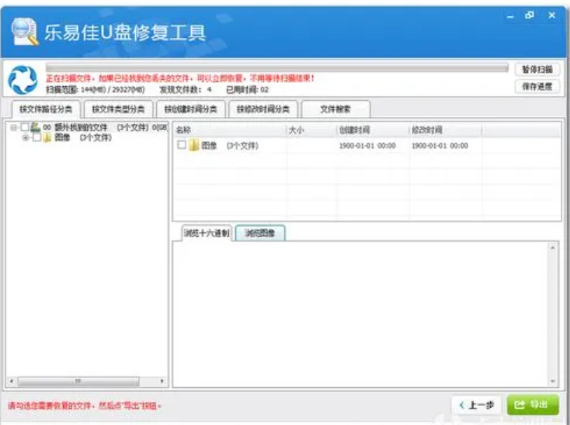 3、操作簡單,只需幾步,輕輕松松恢復丟失的數據。有效處理各類問題,比如:U盤設備發生故障、人為操作失誤、病毒破壞等造成數據丟問題。邊掃描邊顯示,找到數據即可恢復,不用等掃描完成。掃描速度快,可以達到U盤讀取數據的極限。