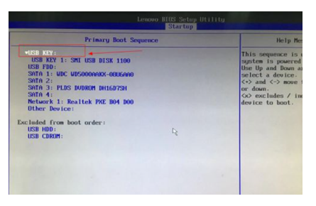6、進入設置明細界面,通過按小鍵盤的“+”和“-”(加減號)來實現順序的改變,將usb key 設置為第一個,有的電腦可以能是usb Hdd。