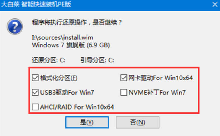 4、稍后彈出還原設置窗口界面,建議大家勾選“網卡驅動”以及“USB驅動”復選框,點擊“是”進入下一步。