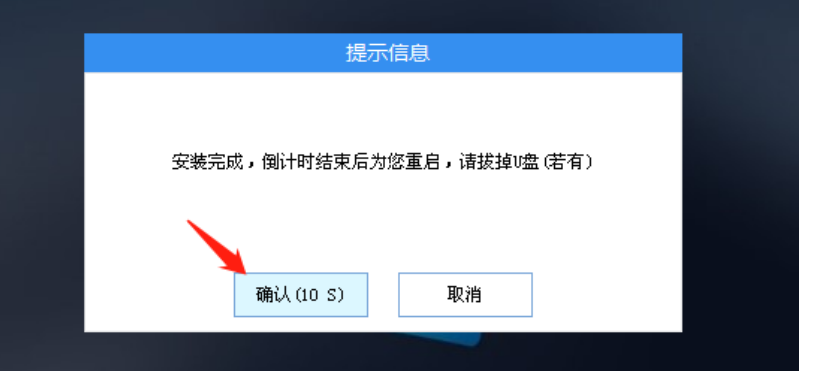 8、系統安裝完畢后,軟件會自動提示需要重啟,并且拔出U盤,請用戶拔出U盤再重啟電腦。