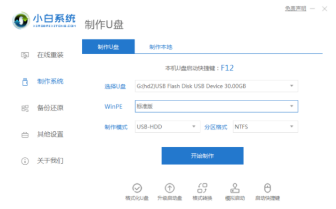 1.首先關閉殺毒軟件,打開小白一鍵重裝系統軟件,u盤插入電腦。點擊頁面左側的“制作系統”,點擊開始制作。