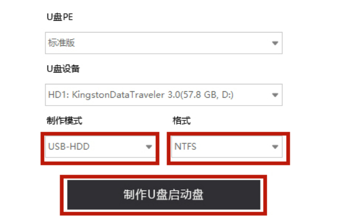 3、默認將制作模式改為“USB-HDD”,格式改為“NTFS”后,點擊“制作U盤啟動盤”;