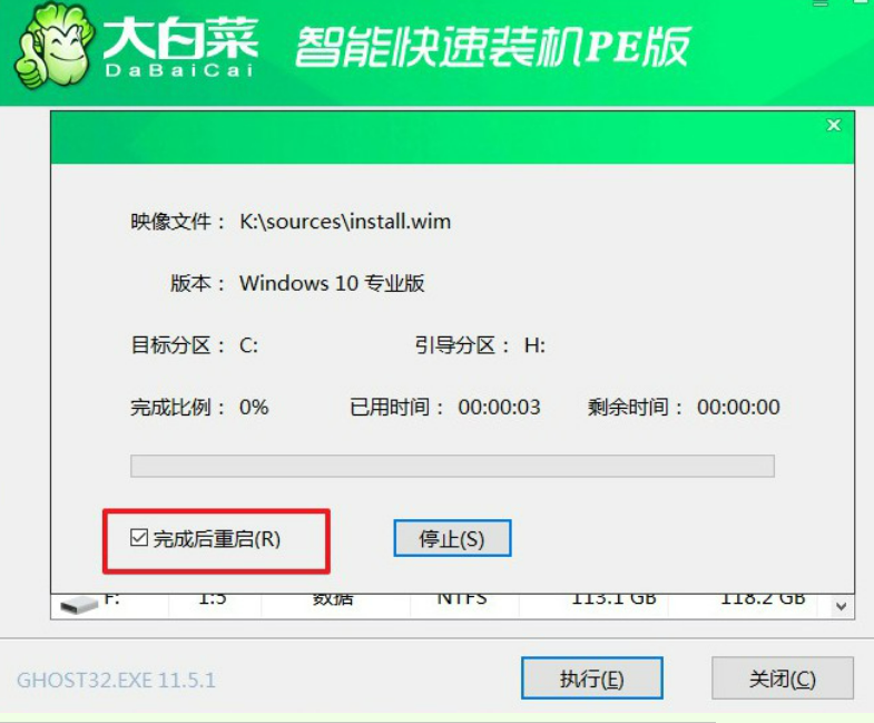 7、彈出大白菜系統安裝進度界面后,核實相關信息,選擇“完成后重啟”。