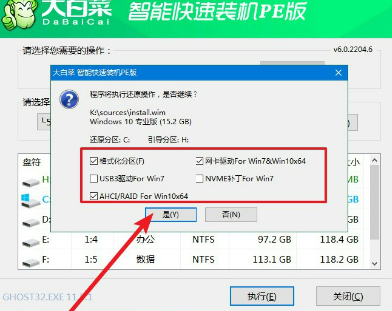 6、在還原界面中,涉及部分系統設置,只需默認勾選,點擊“是”即可。