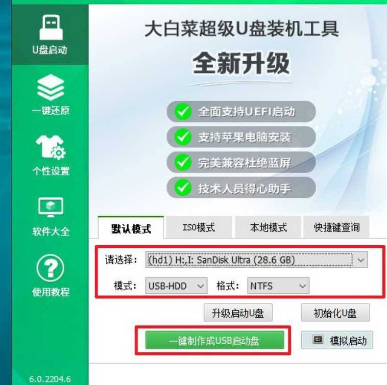 2、打開大白菜U盤啟動盤制作工具后,如圖設置,點擊制作U盤啟動盤就可以了。