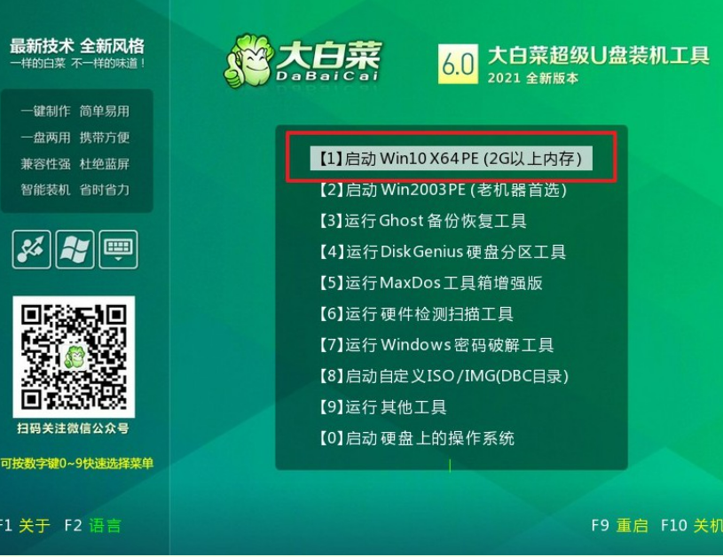 將大白菜u盤接入電腦,即可通過u盤啟動快捷鍵,設置電腦從u盤啟動,進入主菜單安裝。