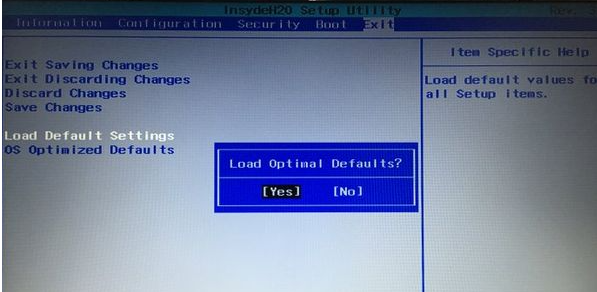 3、使用按↑方向鍵選擇Load Default Settings回車,選擇Yes按回車,加載Legacy默認配置,通常會默認禁用Secure Boot,如果不確定的話,則轉到Security下,查看Secure Boot是否是Disabled,如果不是的話就手動改下就可以啦。