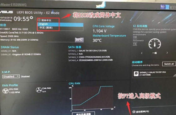 1、重啟華碩電腦,期間按esc或f8進入BIOS設置,將bios改成簡體中文版,隨后按F7進入高級模式。