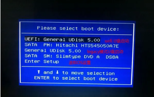 2、這時候就會來到啟動項選擇菜單了,找到u盤啟動項,比如圖中的General UDisk表示u盤,一般是顯示U盤的名稱,比如Toshiba、Kingston、Sandisk等帶,有UEFI的是uefi模式的啟動U盤項,不帶uefi的是legacy模式的U盤啟動項。選擇好U盤啟動項,按回車鍵即可進入U盤啟動。如果沒有看到U盤,則選擇Enter Setup進BIOS設置,具體看方法二。