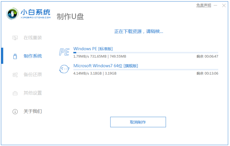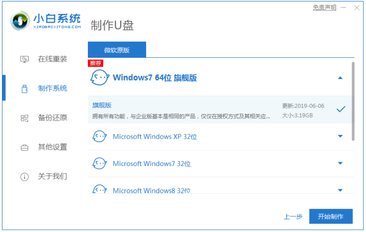 1、打開小白一鍵重裝系統選擇win7系統制作u盤啟動;