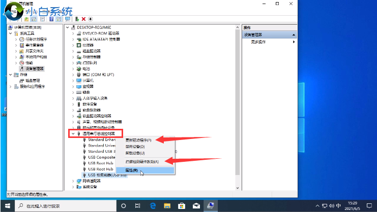 3.在計算機管理頁面中,我們點擊左側的設備管理器,然后在右側找到“通用串行總控制器”在下方找到usb驅動,點擊“更新驅動程序”或“掃描檢測硬件改動”解決問題。