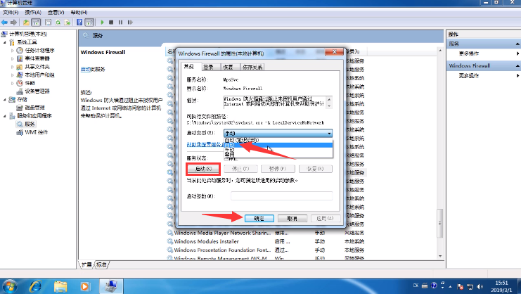 3.我們將windows防火墻啟動類型改為”自動“,點擊”啟動“,然后”確定“即可。