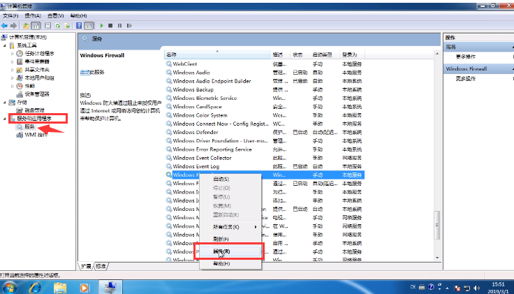 2.在頁面中,我們找到”服務和應用程序“點擊”服務“選項,右側找到windows防火墻,點擊”屬性“。