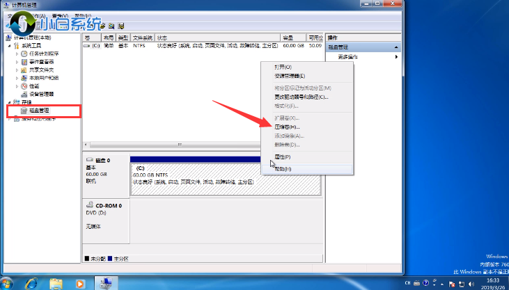 2.進入頁面后,我們找到下方的"磁盤管理"功能,然后右側磁盤的位置右鍵點擊”壓縮卷“。