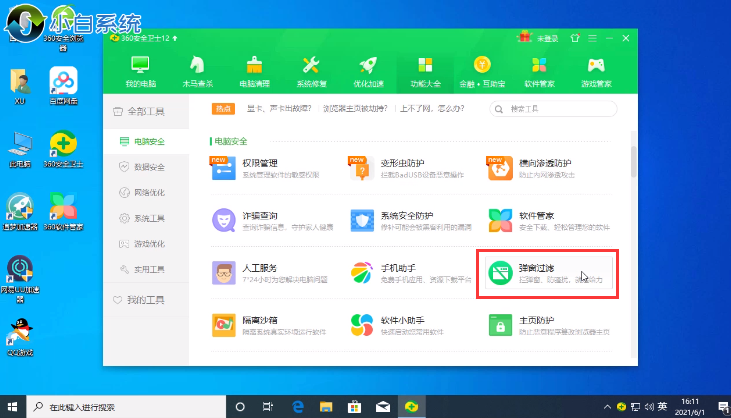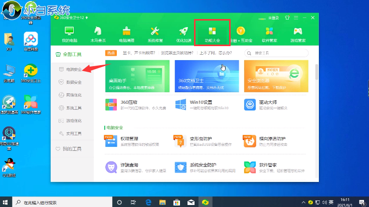 4.我們也可以打開360安全衛士,進入頁面后選擇”功能大全“在左側點擊”電腦安全“選項。