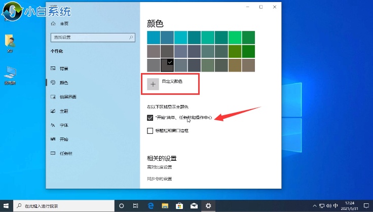 4.我們在“以下區域顯示主題色”中勾選”開始菜單,任務欄和操作中心“,然后我們選擇自定義顏色即可。