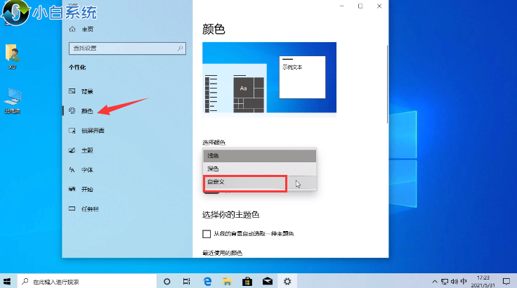 2.進入頁面中,我們在左側點擊“顏色”,右側在選擇顏色下方點擊“自定義”。